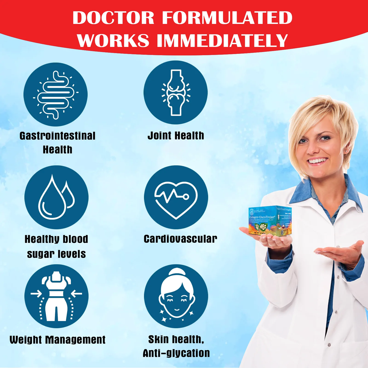 Collagen GlucoTrojan combines the best of both worlds — glucose support and beauty-enhancing collagen — in one daily supplement. With a synergistic blend of GlucoTrojan’s blood sugar-balancing herbs and skin-rejuvenating collagen peptides, this powerhouse capsule helps you look and feel your best from the inside out.